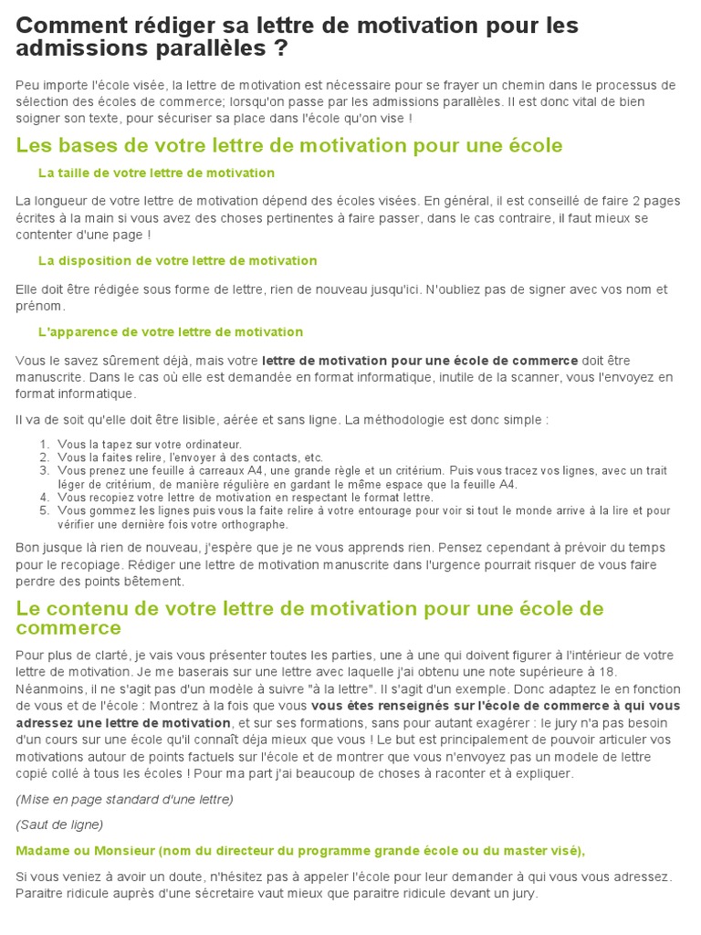 Le candidat doit donc a minima s être intéressé à l école visée et avoir effectué des recherches sur la formation qu elle propose le mieux étant de s être rendu sur place et d avoir rencontré des étudiants ou des professeurs à des. Une bonne lettre de motivation doit être simple et courte. Voici quelques conseils pratiques pour bien la rédiger lorsque vous postulez à un emploi.